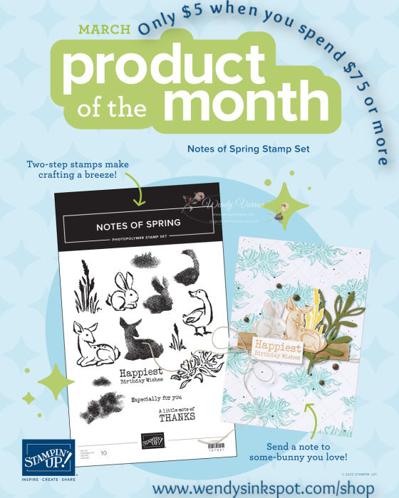 March Product of the Month, Notes of Spring Stamp Set, is now available! This set features sweet springtime animals including a deer, bunny, and duck along with delicate river plants that add beautiful detail to your projects. It’s ideal for creating soft, layered, watercolor‑style images with ease. The set also includes versatile, all‑occasion sentiments, making it a wonderful choice for handmade cards such as birthdays, thank‑yous, and more.