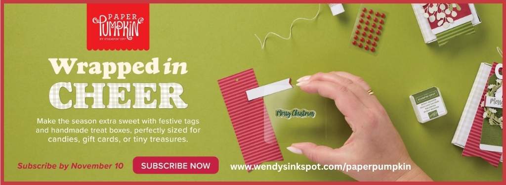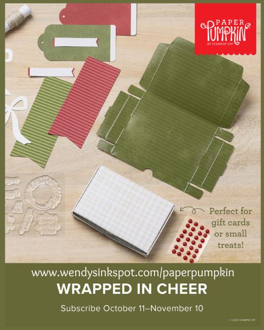 The holidays are just around the corner, and the November Paper Pumpkin Kit – Wrapped in Cheer is ready to help you make the season a little sweeter! This kit makes it easy to create festive little treat boxes and coordinating tags that are just the right size for gift cards, candies, or small surprises. With classic Christmas colors, delicate greenery accents, and a touch of texture, each project brings a cozy, heartfelt feel to your holiday gifting.